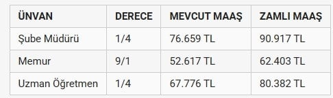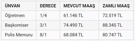 Yeni maaş hesaplamalarına göre 1/4 derecedeki öğretmen maaşı 61.146 liradan 72.519 liraya yükseldi. Aynı derecedeki bir vaizin maaşı ise 63.916 liradan 75.804 liraya çıktı. Bu durum sosyal medyada geniş yankı uyandırırken birçok kişi öğretmen maaşlarının vaiz maaşlarının gerisinde kalmasına tepki gösterdi.